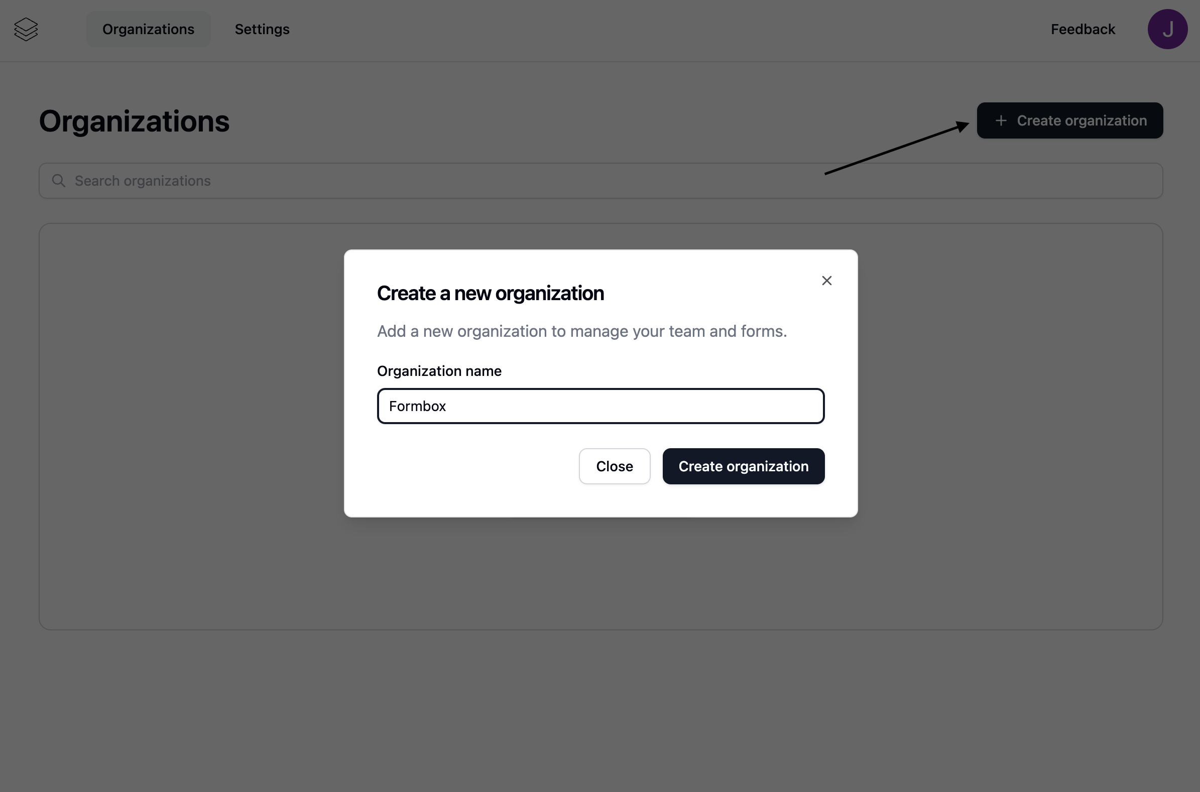 First we need to create an Organization in Formbox dashboard. You can do this by clicking on theCreate organization button in the dashboard.