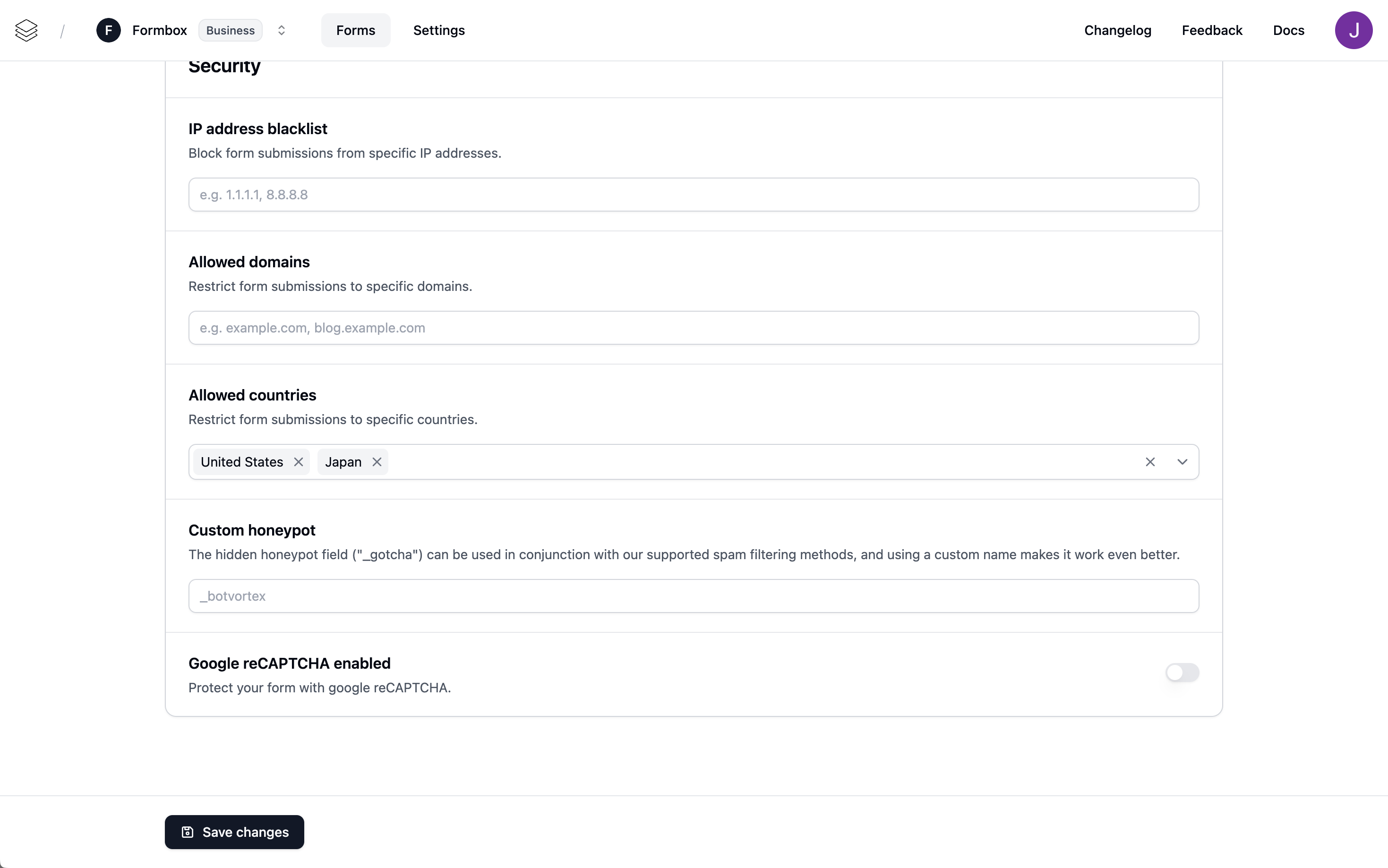 Go to your form settings and scroll down to the Security section. Here you can add the countries you want to restrict your form submissions to.