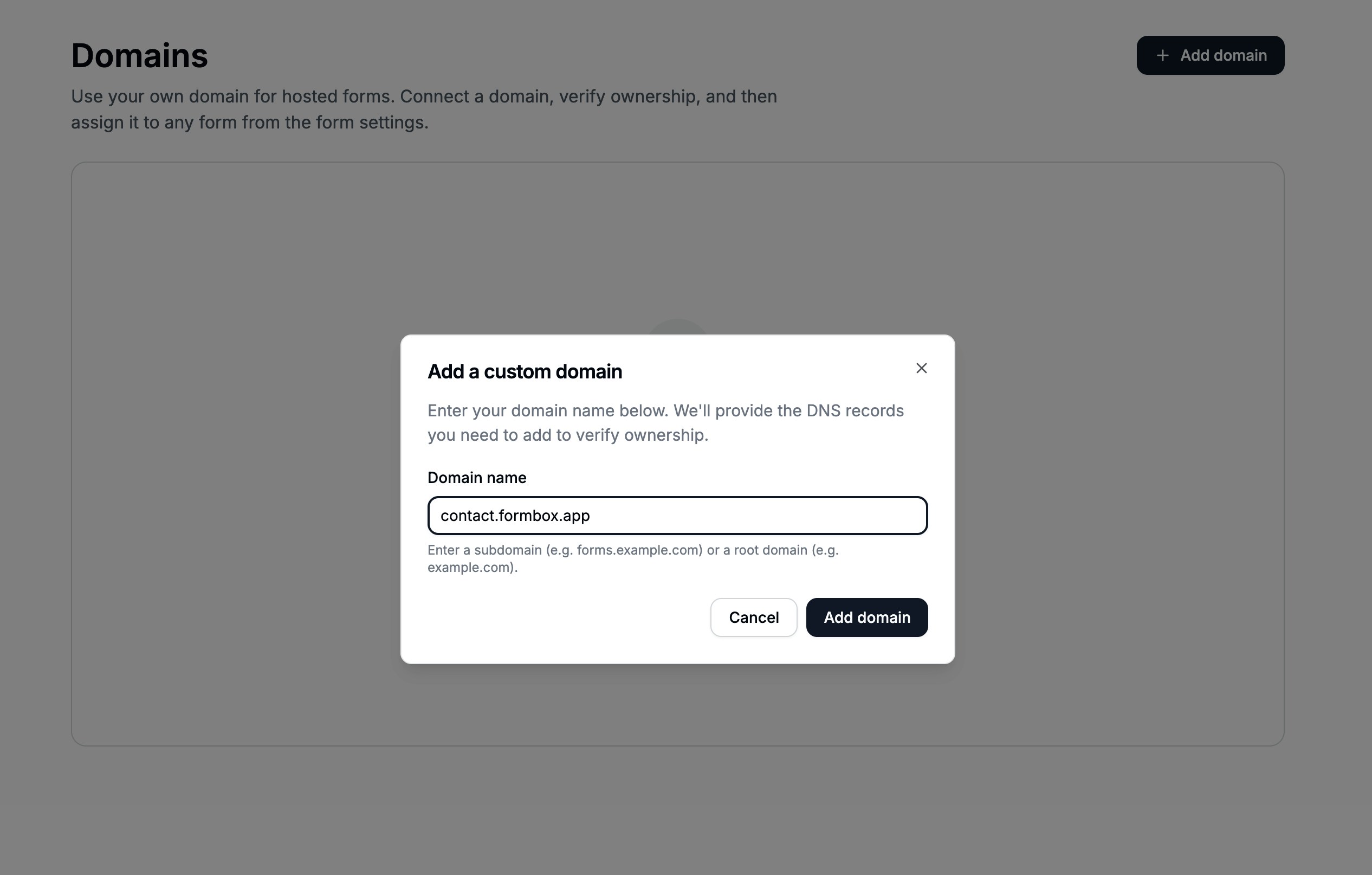 forms.example.com) or a root domain (e.g.example.com). - Click Add domain.