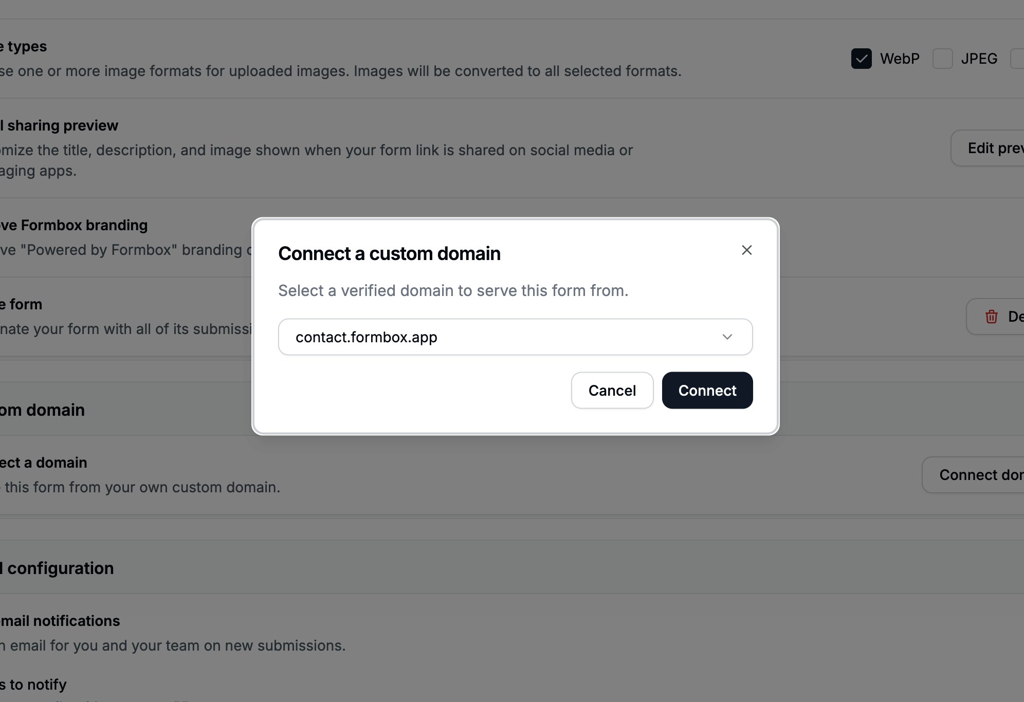 Custom domains are managed at the organization level, so any member with Admin or Member access can add and verify domains from the Domains page. Once a domain is verified, it can be assigned to a hosted form from that form’s Custom domain settings.