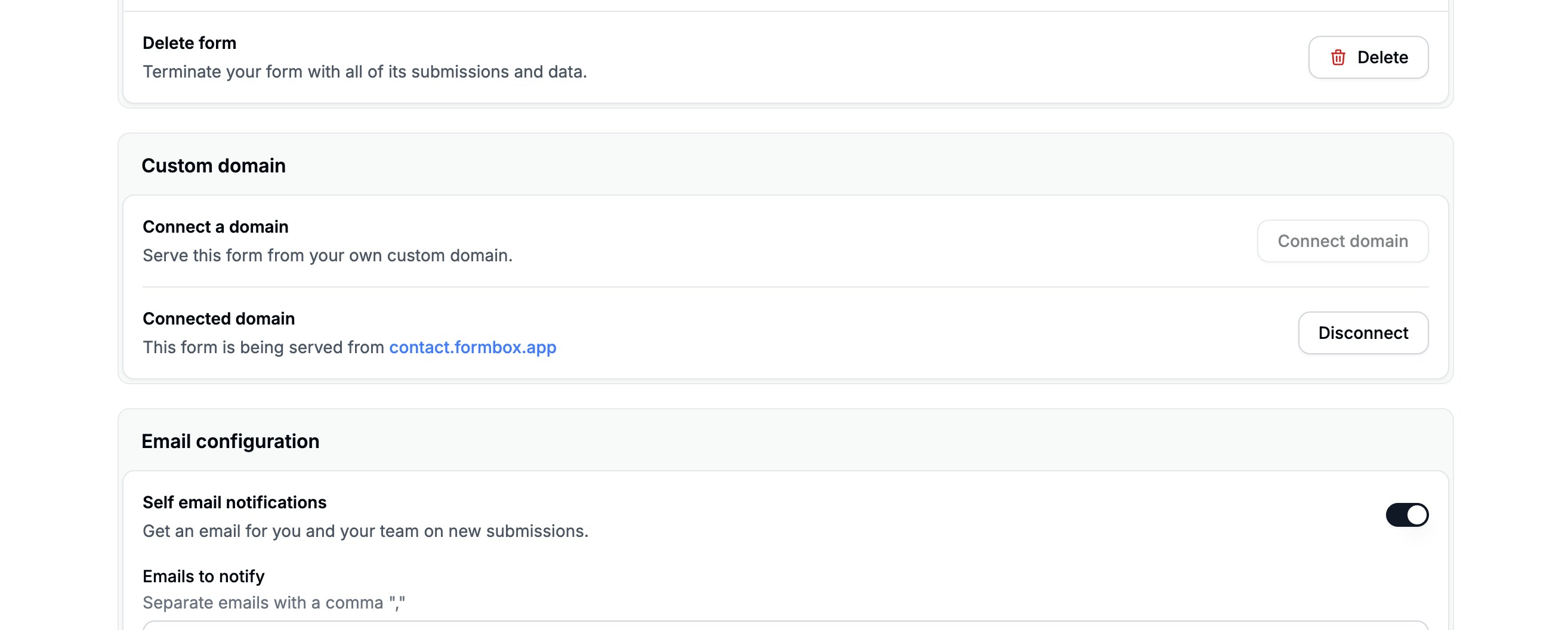 To disconnect a domain from a form, go back to the Custom domain section in form settings and click Disconnect.