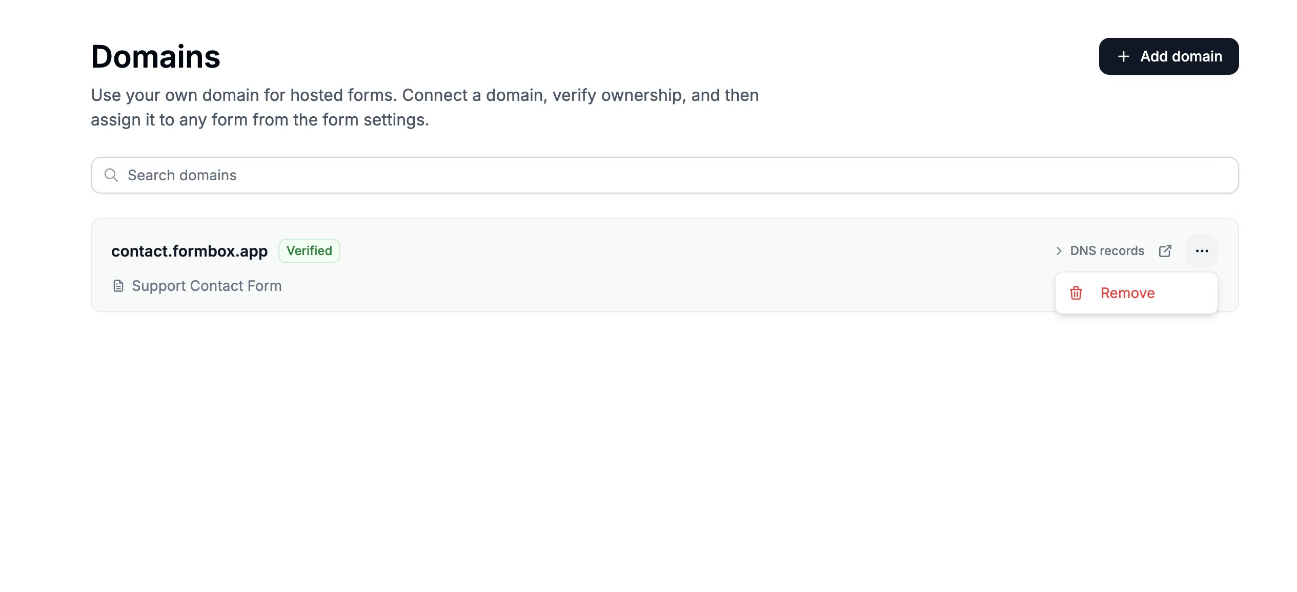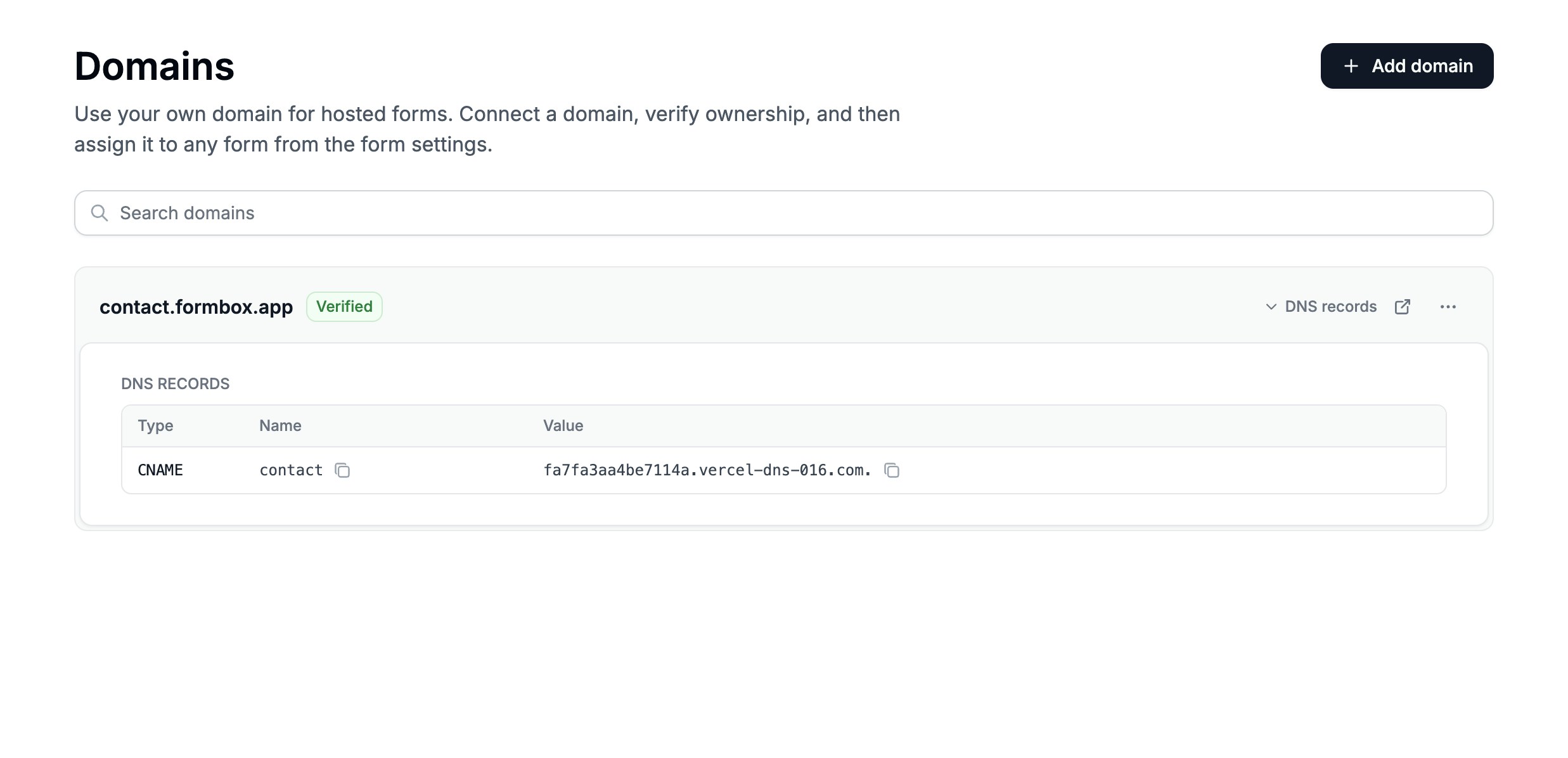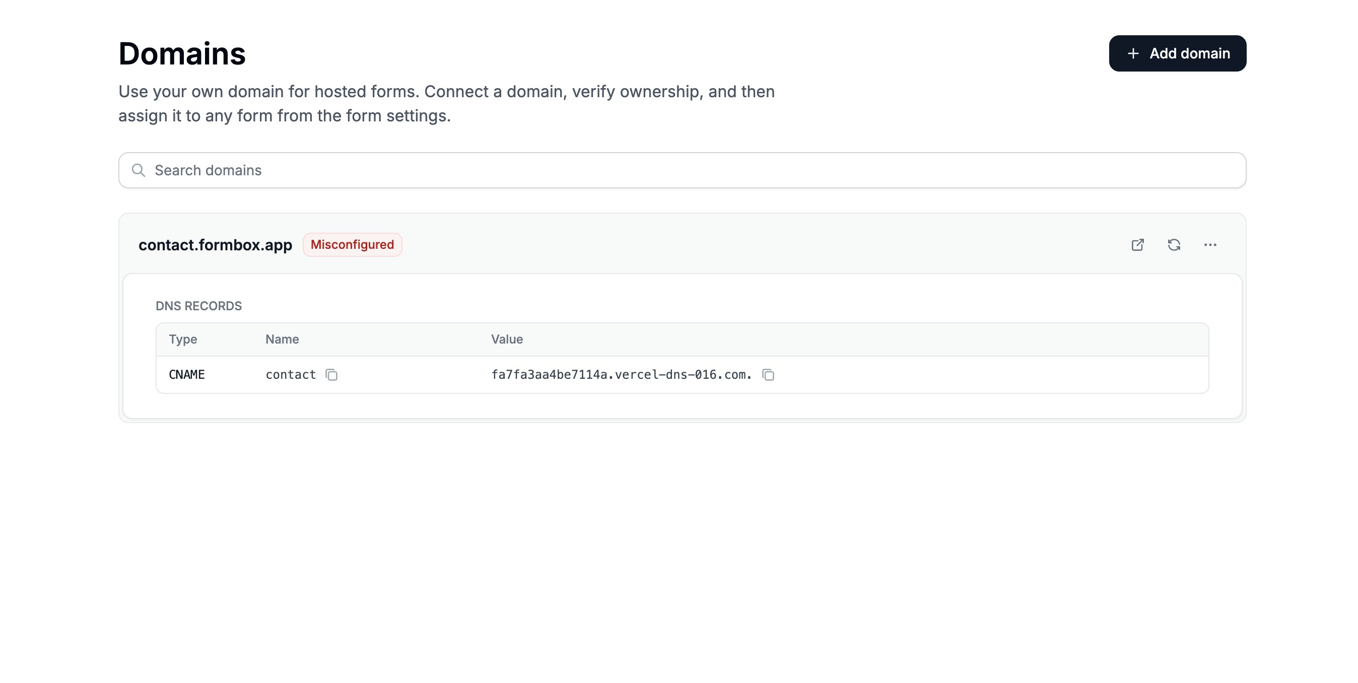 After adding a domain, Formbox will display the DNS records you need to configure with your domain registrar or DNS provider.