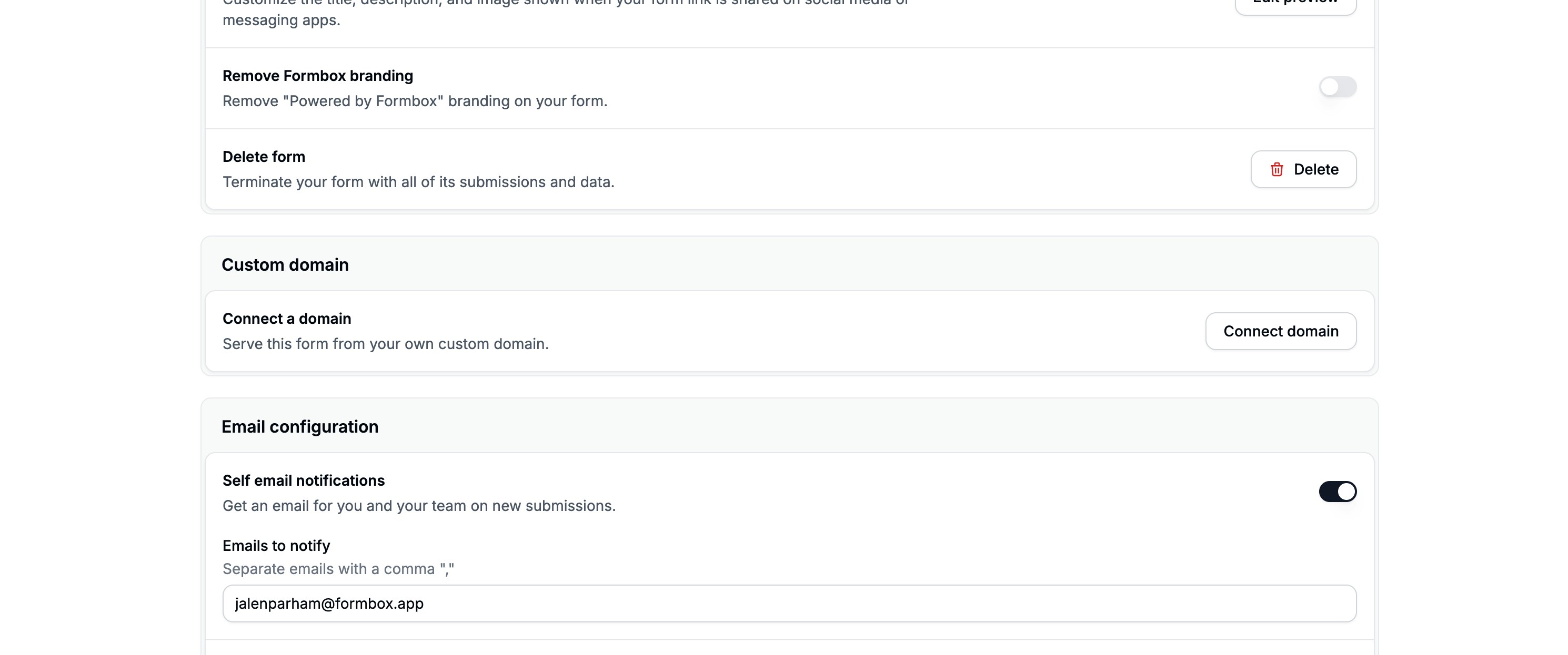 Custom domains let you serve your hosted forms from your own domain instead of the default Formbox URL. Instead of sharinghttps://app.formbox.app/forms/abc123, your respondents will see a clean, branded URL like https://forms.yourdomain.com.