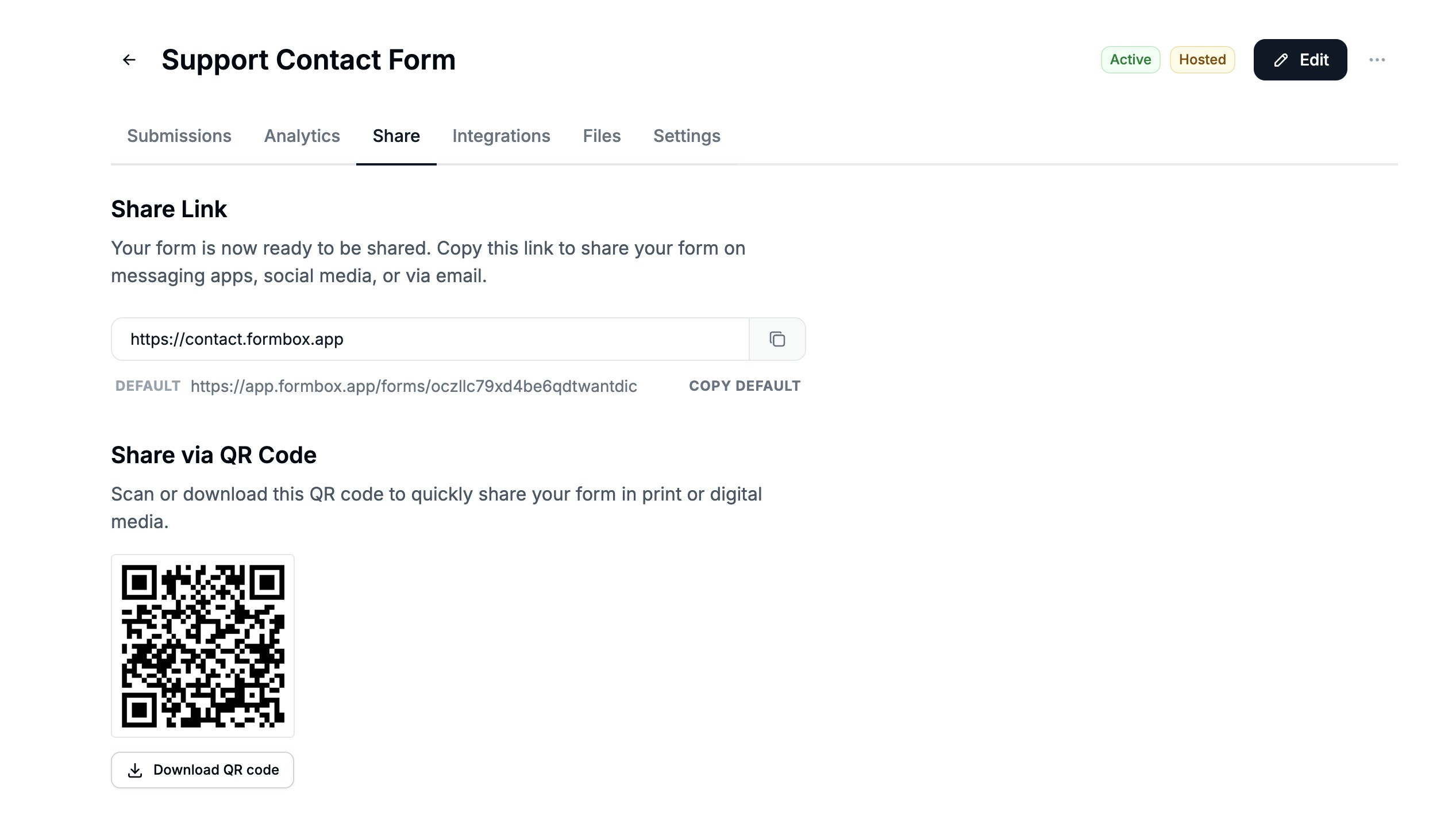 Once a custom domain is assigned to your form, the Share tab will automatically use that domain URL as the primary share link. The default Formbox URL is still available as a fallback.