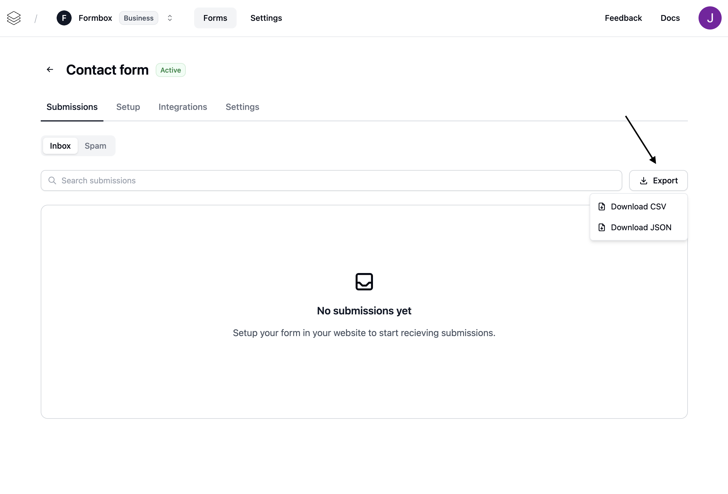 In case you need to do something with your form submissions data, Formbox allows you to export your submissions in CSV or JSON file formats.