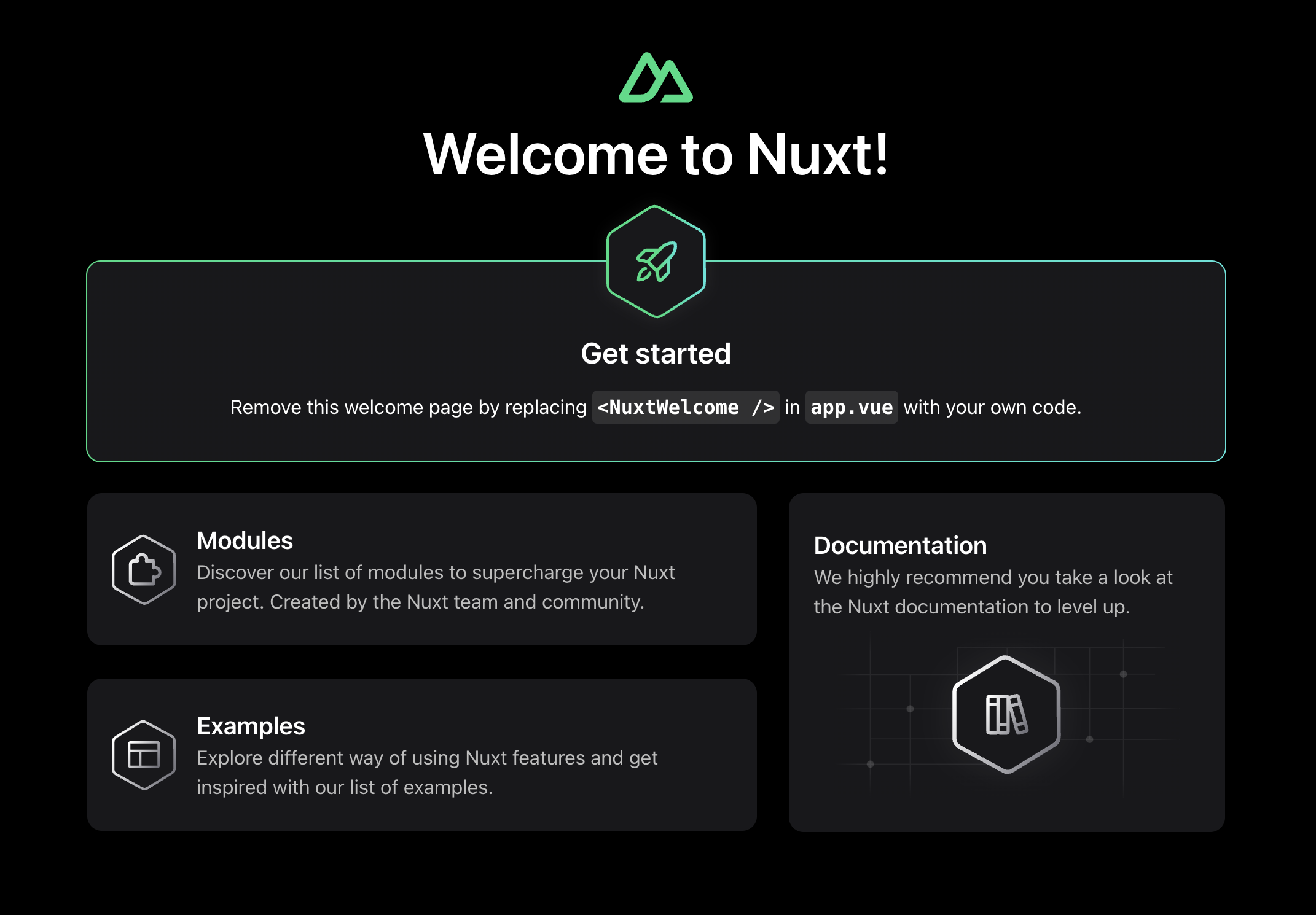 To get up and running quickly, we will follow the official Nuxt installation guide to create a new Nuxt project. In your terminal, run the following command:http://localhost:3000. You should see a new Nuxt application running.