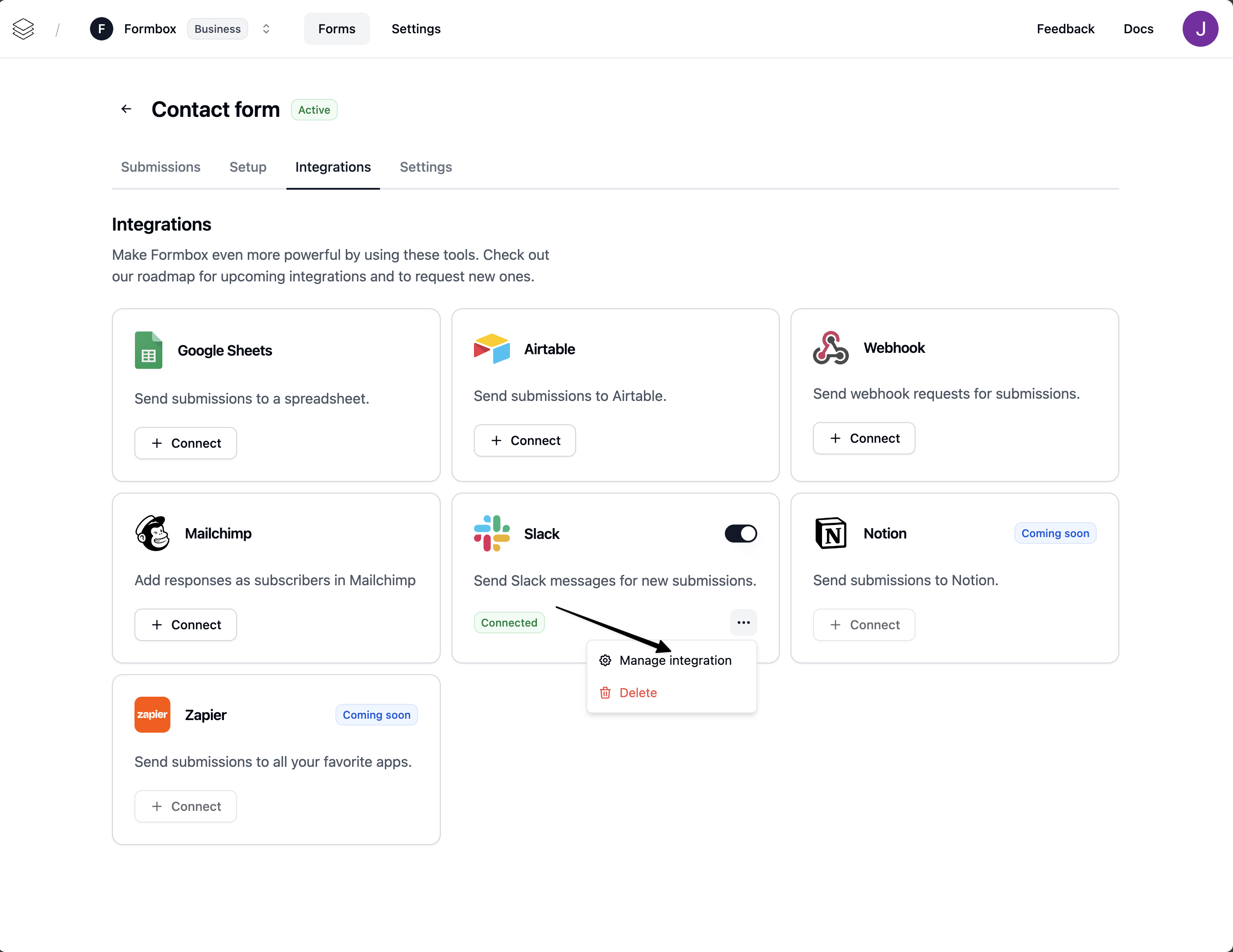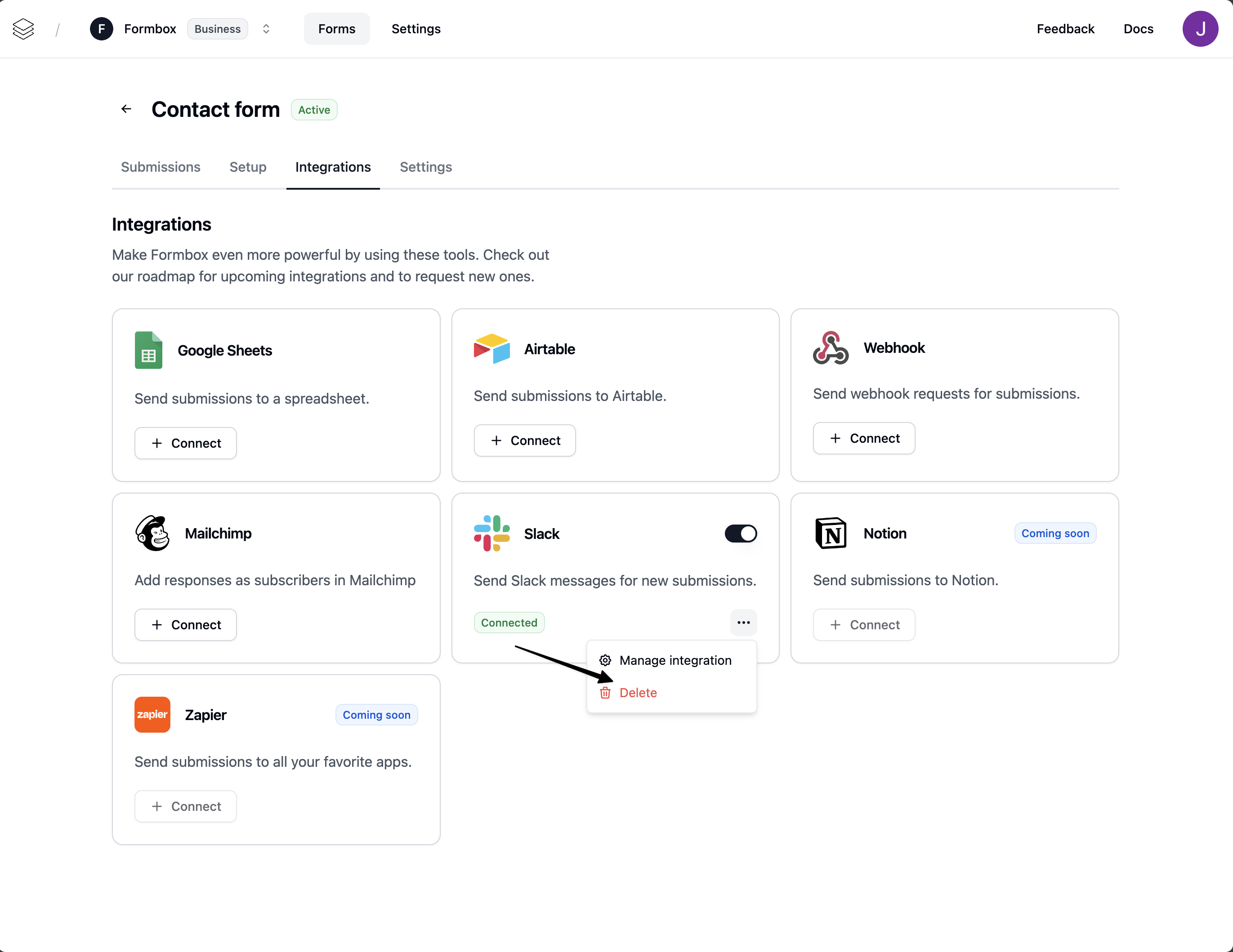 If you no longer want your integration to send messages to your Slack channels, click the Delete option in the dropdown menu. Removing the integration means that Formbox will not send messages to any of your Slack channels for any future form submissions.