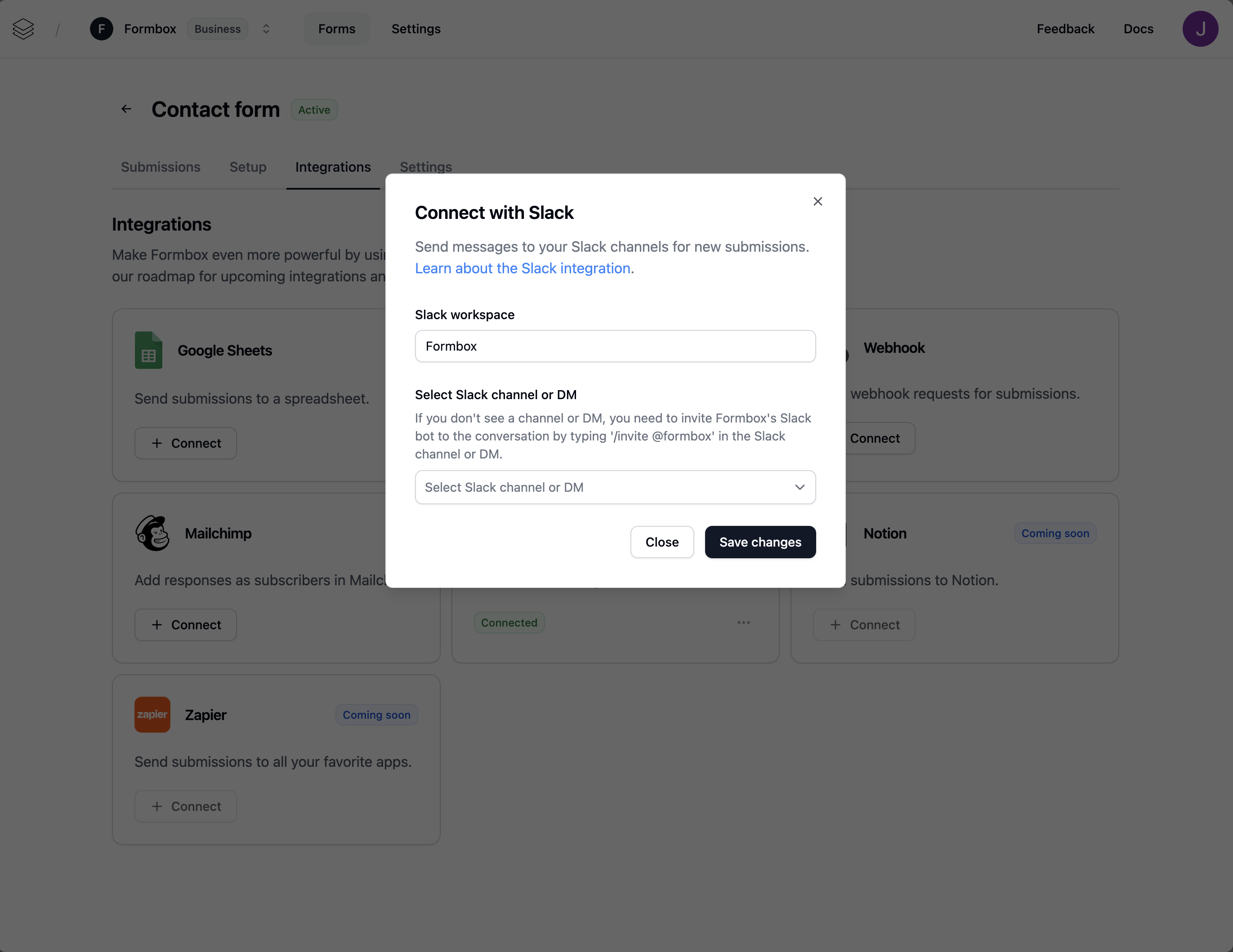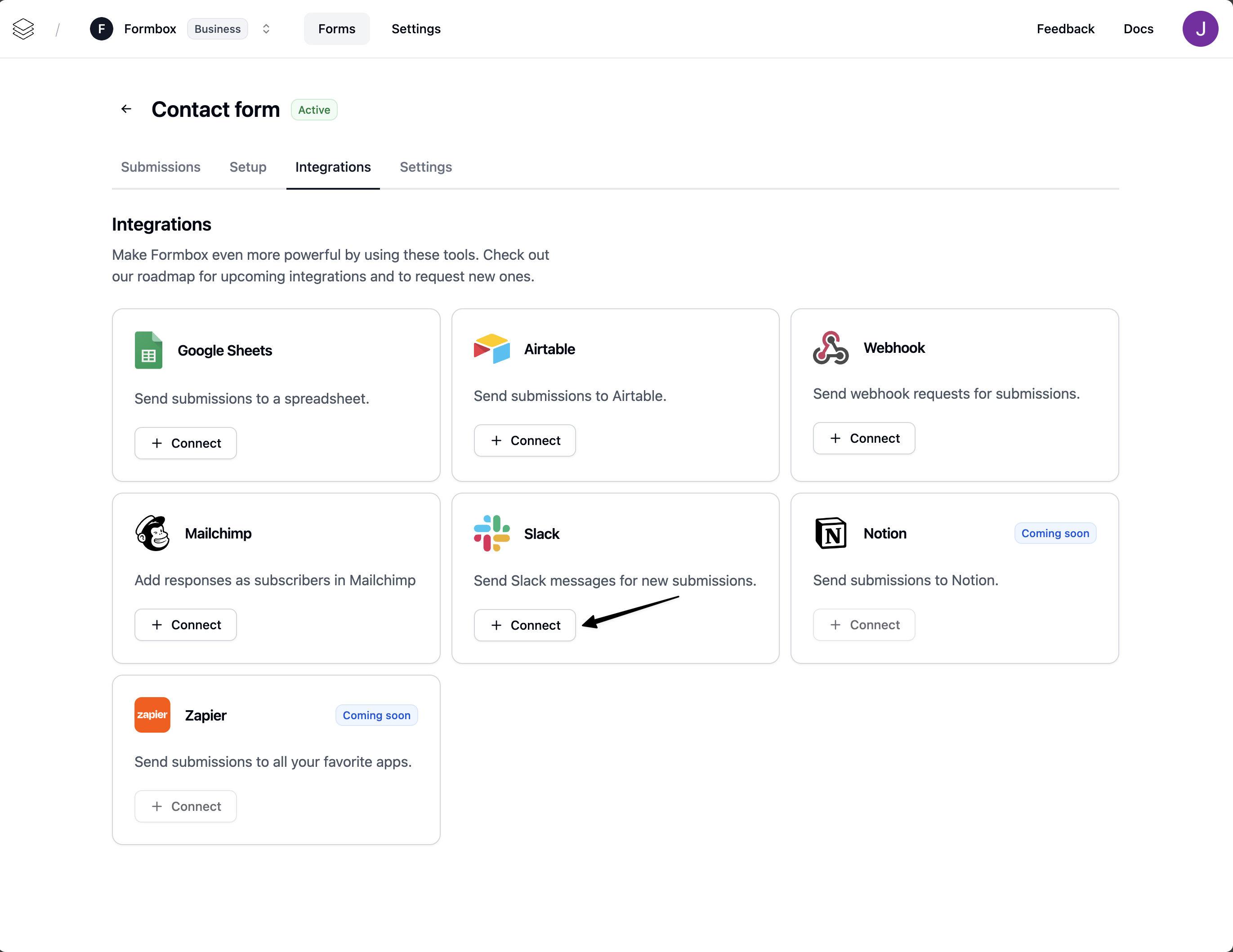 Go to the Integrations tab of your Formbox form and click Connect on the Slack integration.