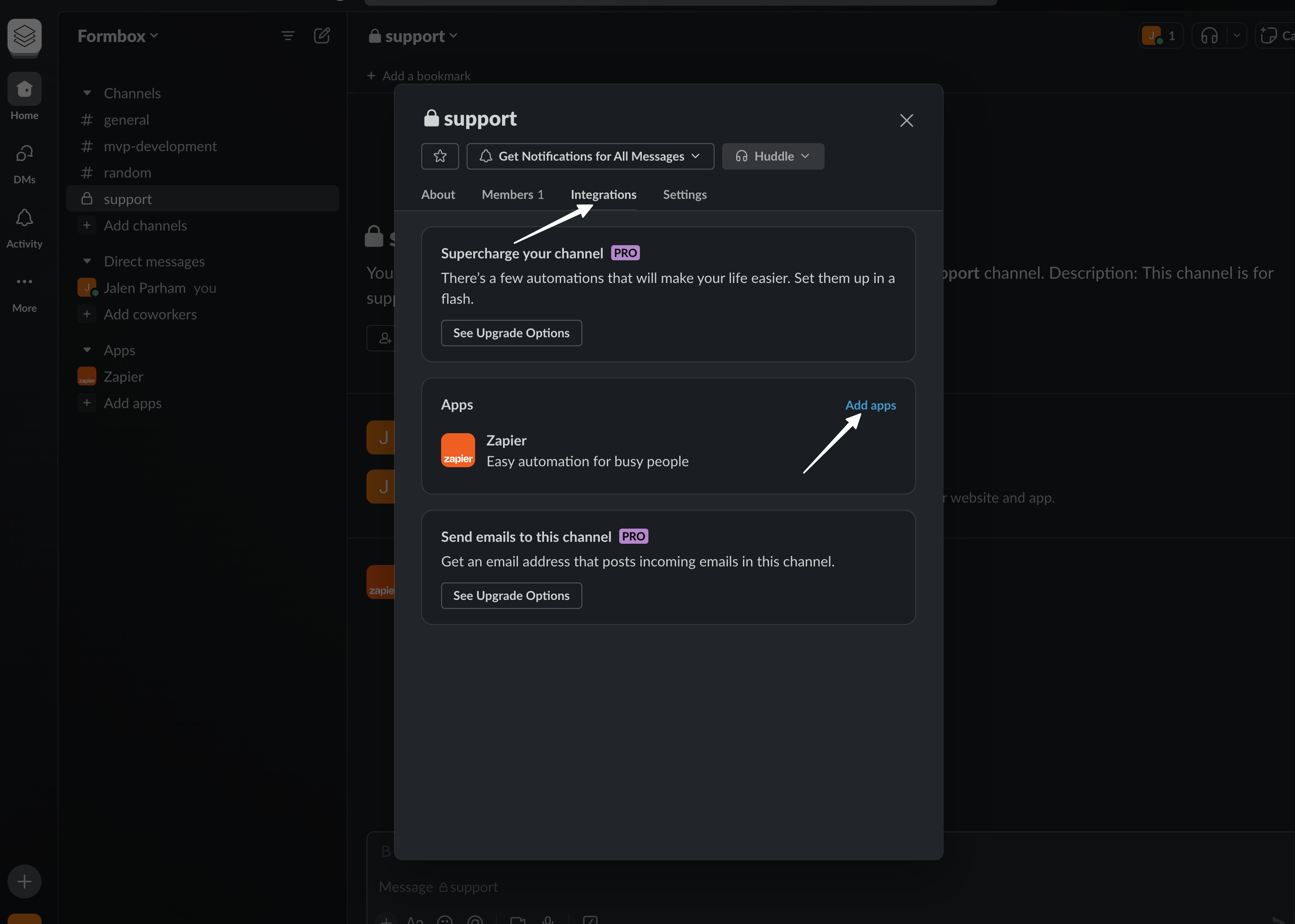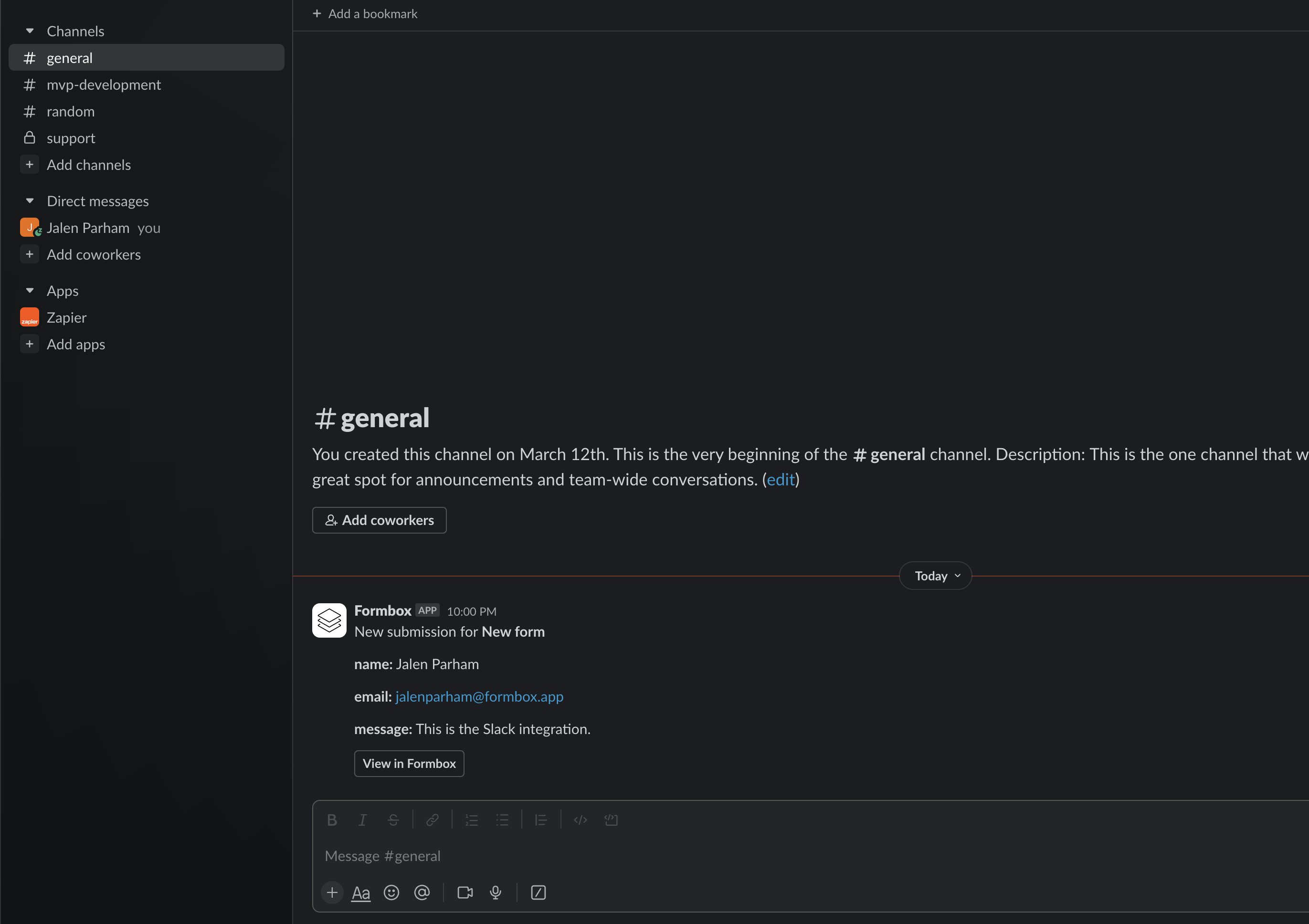 If you don’t see a channel or DM, you need to invite Formbox’s Slack bot to
